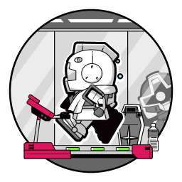 A Gundam Evolution GM robot is seen exercising on a treadmill, sweating from the effort in a gym setting.