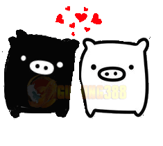 Cute black and white Monokuroboo pigs show affection with floating red hearts, featuring Gunung388 branding.