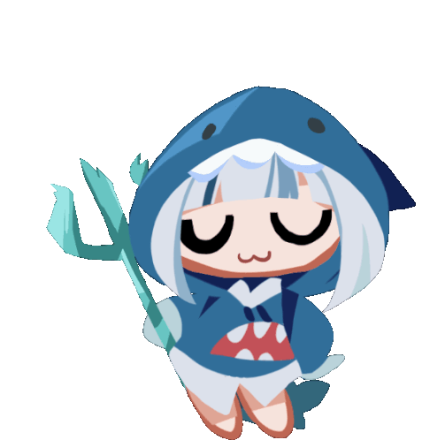Cute animated sticker of Gawr Gura from Hololive English, depicted as a chibi shark girl holding a trident.