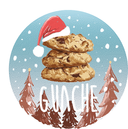 Festive Guache Christmas cookies stacked with a Santa hat, surrounded by snow and pine trees, perfect for holiday cheer.