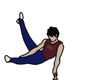 Male gymnast Kohei Uchimura performs a dynamic pommel horse skill, showcasing strength and balance.