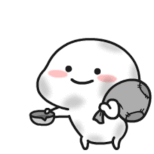 A cute, round, white cartoon character with rosy cheeks smiles while holding a gray bag and a small cup or bowl.