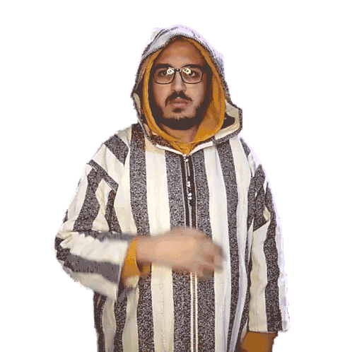 A man in a striped djellaba and glasses makes a 'hachouma' gesture, pointing to his eye and then his mouth.