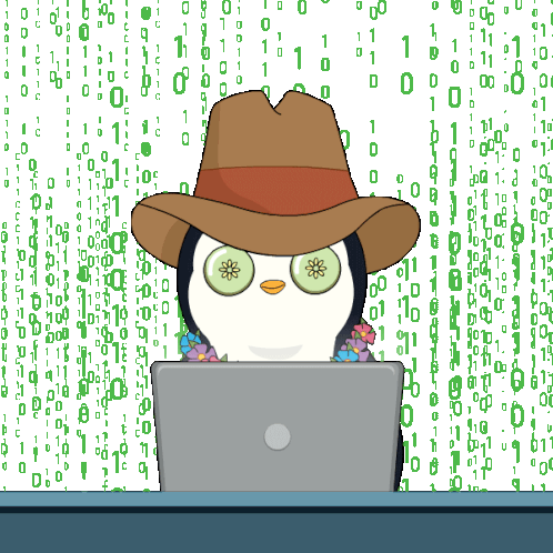 An animated sticker of a cool penguin hacker with cucumber eyes, coding on a laptop amidst binary.