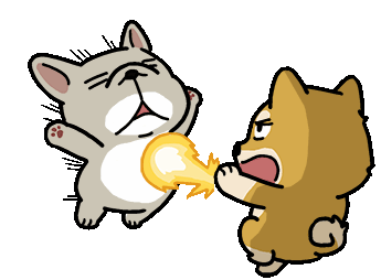 Two cartoon dogs, one white and one brown, are engaged in a playful fight, with one dog delivering a 'Hadoken' style punch.