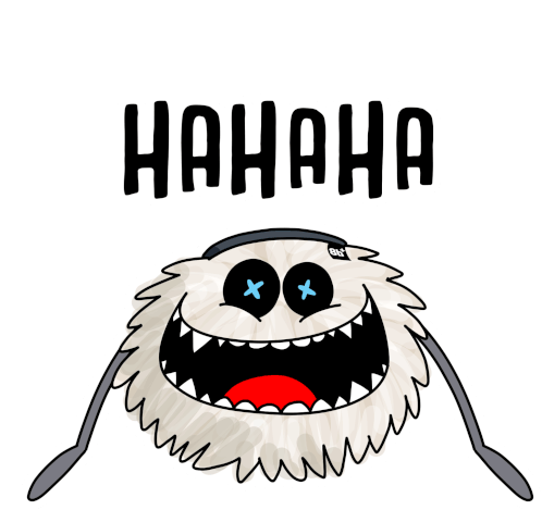 A fluffy, white monster with big eyes and a wide smile laughs heartily, exclaiming 'HAHAHA' in this animated sticker.