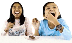Keira Charma and another girl laugh hysterically while eating, sharing a joyful and funny moment.