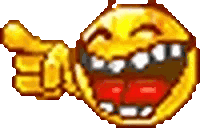 A yellow pixel art smiley face with black eyes and a wide smile points to the right, conveying humor and laughter.