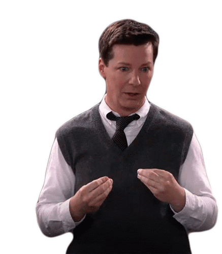 Sean Hayes as Jack McFarland from Will & Grace reacts with wide eyes and a big laugh, gesturing with his hands in a funny, surprised way.