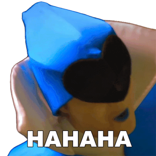 Angi Viper, in a blue costume and heart-shaped sunglasses, laughs heartily with the caption "HAHAHA."
