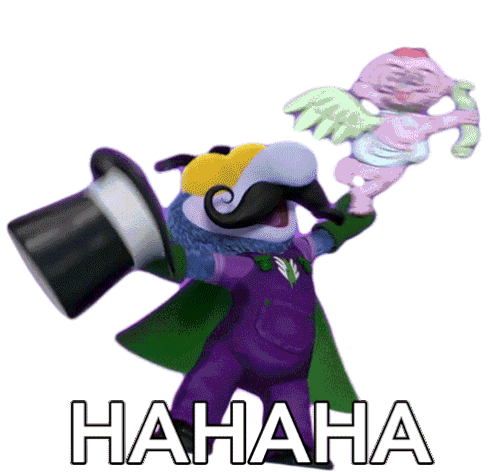 Dr Meanzo from Muppet Babies delivers a maniacal 'Hahaha' laugh, holding a top hat and a cupid figure.