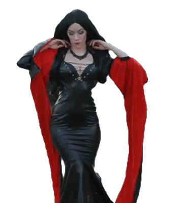 Kay Lynn Syrin in a gothic black dress with red sleeves, adjusting her hood and flaunting her hair.