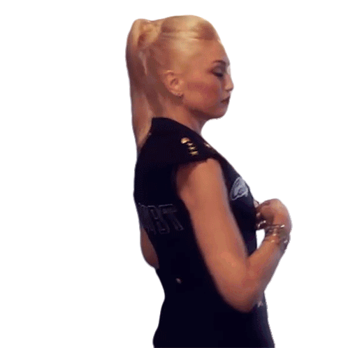 Gwen Stefani performs a stylish hair flip, showcasing her high ponytail and a top with "NODOUBT" on the back.