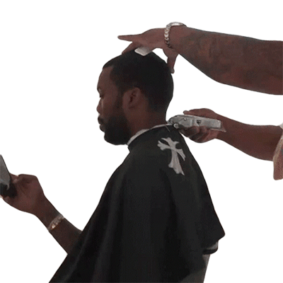 Meek Mill getting a fresh haircut at the barber shop, looking at his phone. Features the rapper during a grooming session.