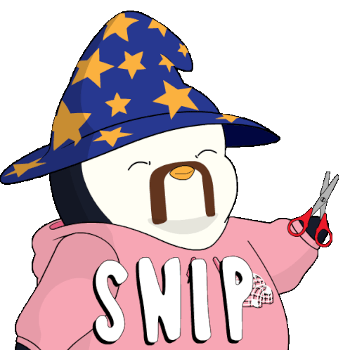 A cute penguin wizard with a mustache, wearing a "SNIP" hoodie and holding scissors, ready for a haircut.