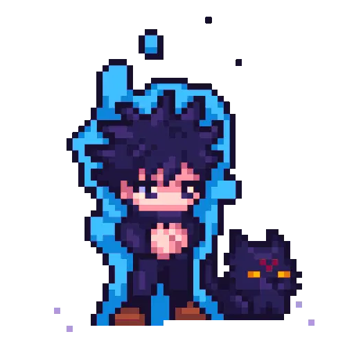 Hakari, the Jujutsu Kaisen character, performs an energetic pixel art dance, flexing his muscles with purple hair.