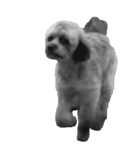 Animated sticker featuring Haku, a small fluffy dog, walking forward with a determined gait. This charming animation is associated with GIDLE.