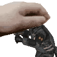 A playful animated sticker featuring a hand holding a toy gun, aiming at a Half-Life Combine Soldier statue.