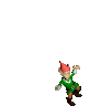 A pixelated Halflings Leprechaun from Age Of Wonders2, wearing a red hat and green tunic, walks and dances.