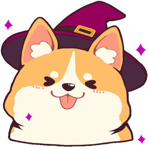 A cute cartoon Corgi puppy wears a purple witch hat, sticking its tongue out with playful sparkles around it.