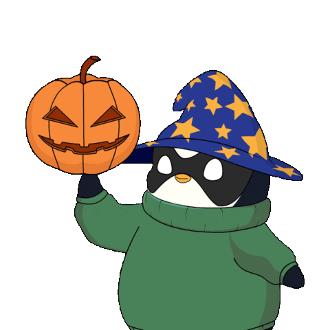 A cute Pudgy Penguin wizard in a green sweater and star-spangled hat spins a spooky carved Halloween pumpkin.