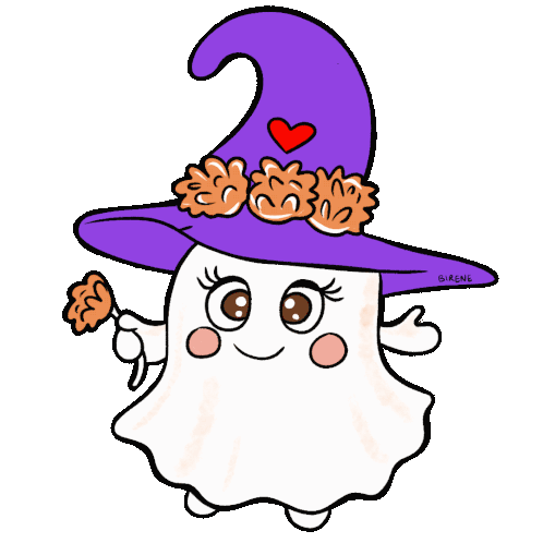 Cute Birene ghost in a purple witch hat with pumpkins, holding a flower, perfect for Halloween fun.