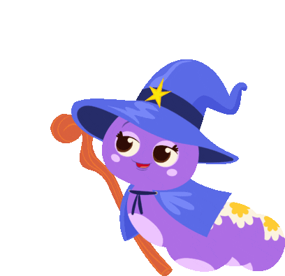A cute purple caterpillar dressed as a witch with a blue hat and cape, holding a staff, ready for Halloween fun.