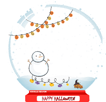 A festive snow globe featuring a snowman, stacked jack-o'-lanterns, and 'Happy Halloween' greeting by Kiggle Design.