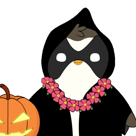A Pudgy Penguin in a spooky Halloween costume with a cloak, mask, and flower lei stands next to a carved pumpkin.