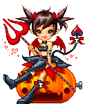 A cute pixel art devil girl with horns and wings sits on a Halloween pumpkin, holding a trident and a spade-tipped tail.