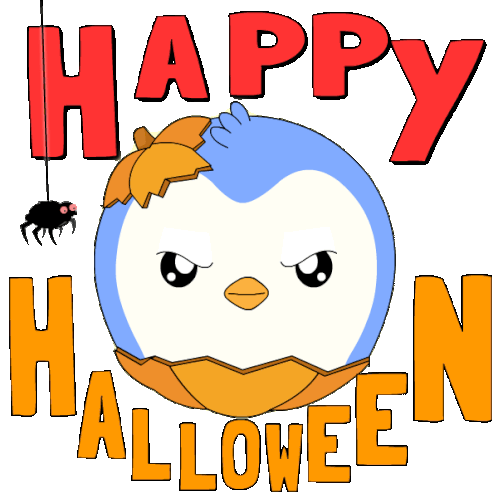 a penguin with a pumpkin on its head and the words happy halloween behind it