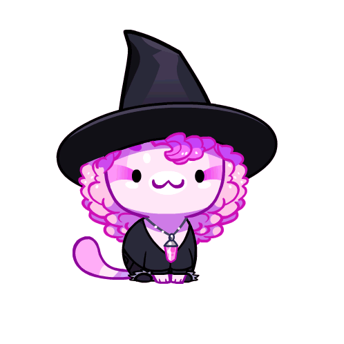 A charming pink witch cat in a black hat smiles, casting magic with heart-shaped bubbles for Halloween fun.