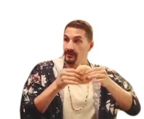 Ovy On The Drums, a man with a beard, happily eats a hamburger, showing a delighted smile. A grateful moment.