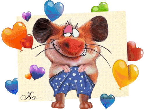 A cheerful cartoon hamster with big ears and a pink nose winks playfully, surrounded by colorful heart balloons.