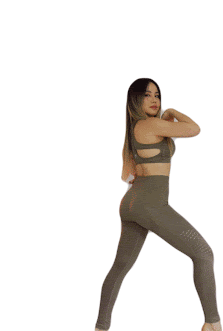 Chloe Ting in a dynamic pose, raising her arm in a dance or fitness move, perfect for Zumba.