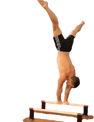 A fit, shirtless man demonstrates impressive strength and balance performing a handstand on parallel bars.