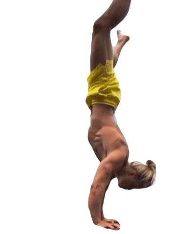 An athletic person in yellow shorts performs a dynamic handstand followed by a backward flip or jump.