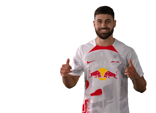Joško Gvardiol, wearing his RB Leipzig jersey, smiles and gives two enthusiastic thumbs up, showing approval and good vibes.