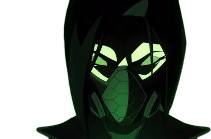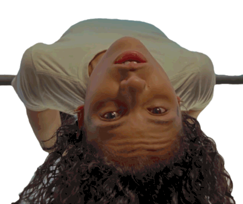 Danielle Balbuena hangs upside down, her curly hair cascading, as she looks directly at the viewer with an intense gaze.