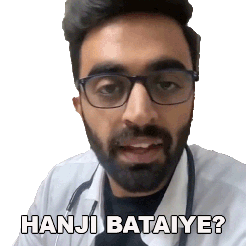 Rahul Dua, dressed as a doctor, asks "Hanji Bataiye?" (How can I help you?), inviting conversation or questions.