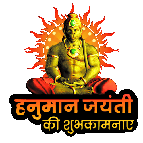 An animated sticker wishing 'Happy Hanuman Jayanti' with a depiction of Lord Hanuman in a meditative pose.
