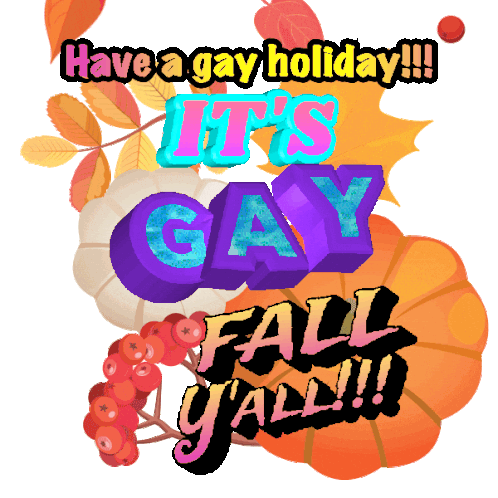 Celebrate autumn with this vibrant sticker featuring pumpkins, leaves, and the festive message 'Have a gay holiday!!! IT'S GAY FALL Y'ALL!!!'