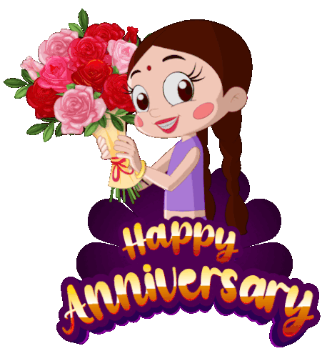 Chutki from Chhota Bheem celebrates a happy anniversary, holding a beautiful bouquet of pink and red roses with a vibrant banner.