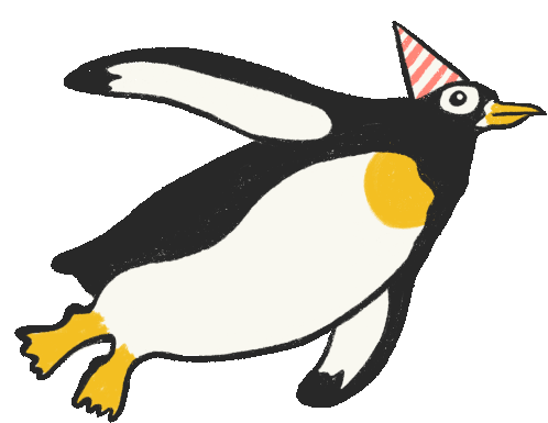 A cheerful penguin in a party hat flies with a heart, wishing 'Happy Birthday'. Perfect for birthday greetings.