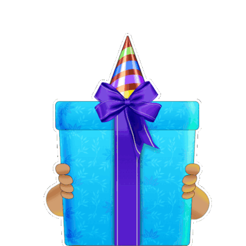 Kalia from Chhota Bheem celebrates a birthday, holding a blue gift box and wishing 'Happy Birthday Dost'.