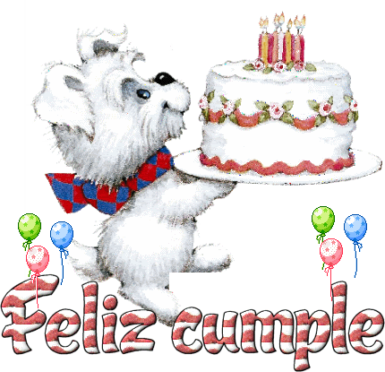 a dog is holding a birthday cake with candles and says feliz cumple in red