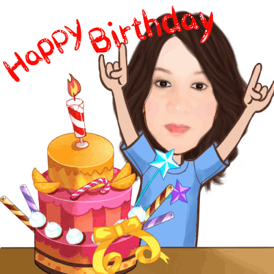 Animated sticker featuring a girl with a birthday cake, candle, and 'Happy Birthday' text, celebrating with rock-on hands.
