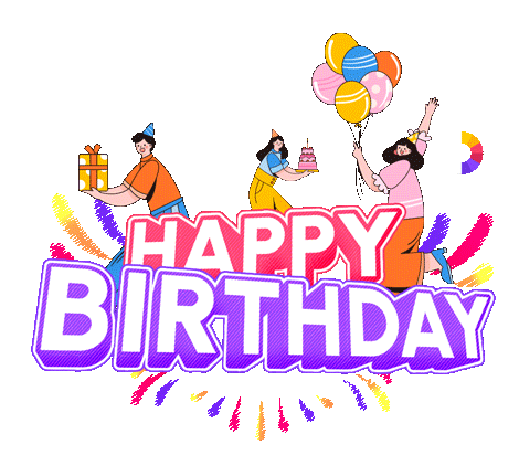 A vibrant animated sticker wishing 'Happy Birthday To You' with people, balloons, cake, and gifts.