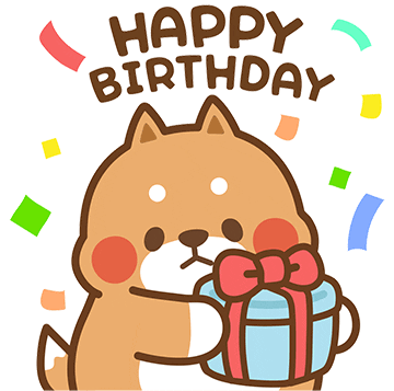 A cute cartoon dog holds a wrapped gift as 'Happy Birthday' text and confetti appear, perfect for celebrations.