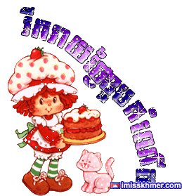 Strawberry Shortcake holding a birthday cake with a small cat, celebrating a happy birthday.
